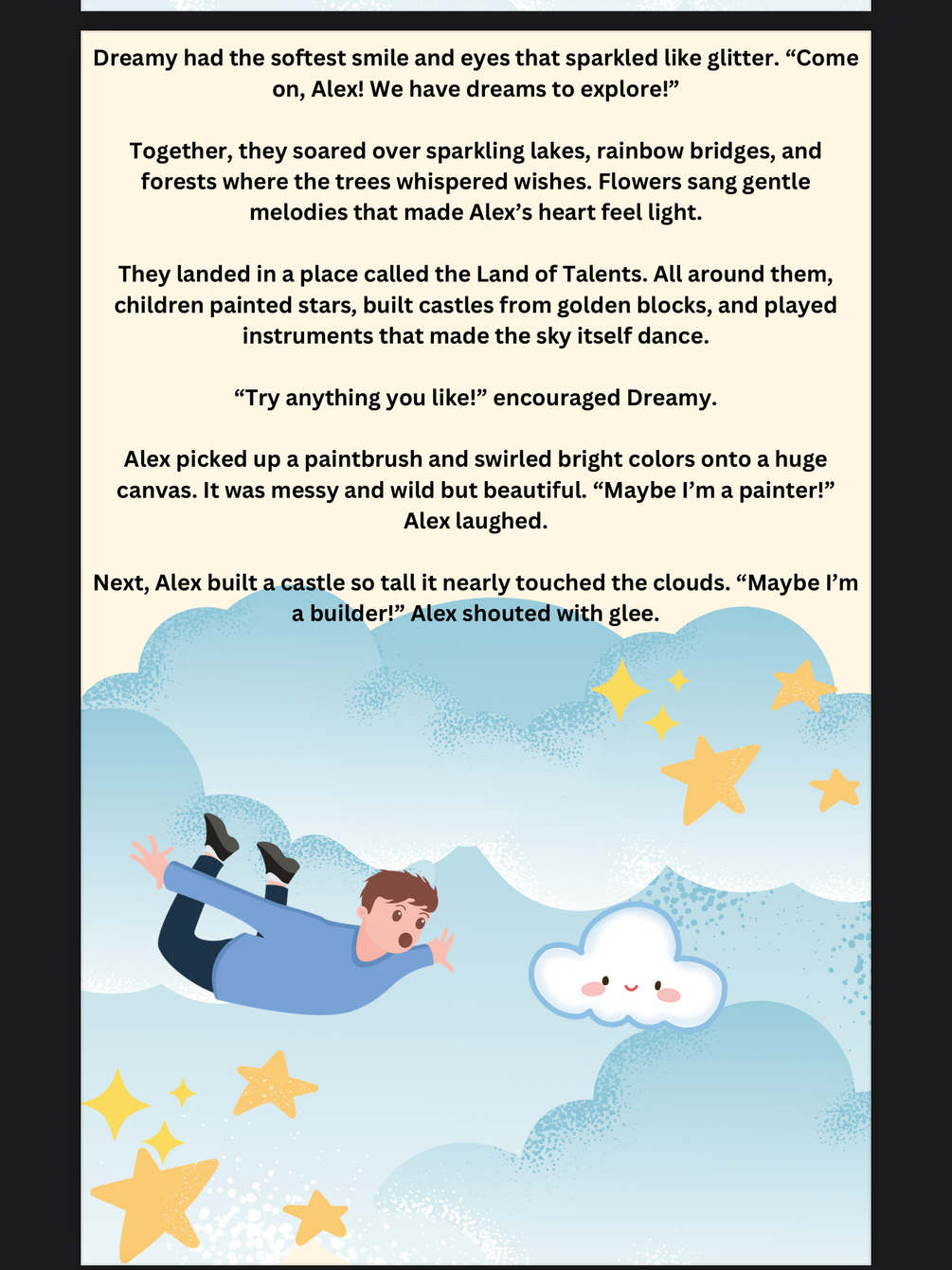 Your Dream is a heartwarming children’s story about Alex, a curious child who embarks on a magical journey to find their true dream. Guided by a friendly, fluffy cloud named Dreamy, Alex explores the Land of Talents, where they paint, build, and make music. But when Alex feels lost, Dreamy shares a beautiful secret: Dreams aren’t always found—they’re made.